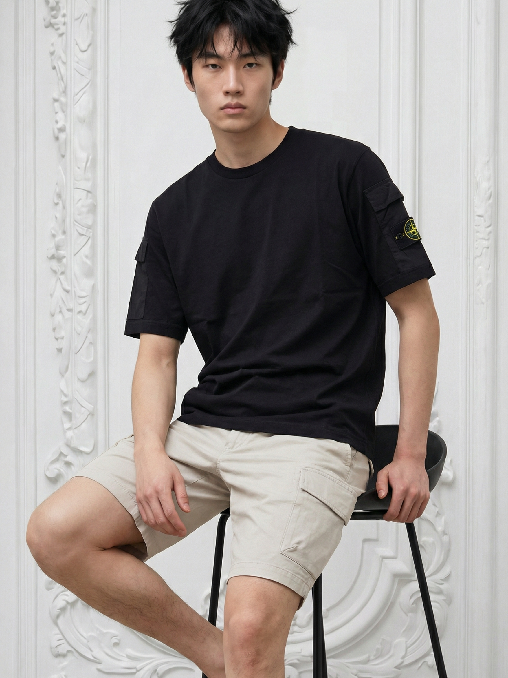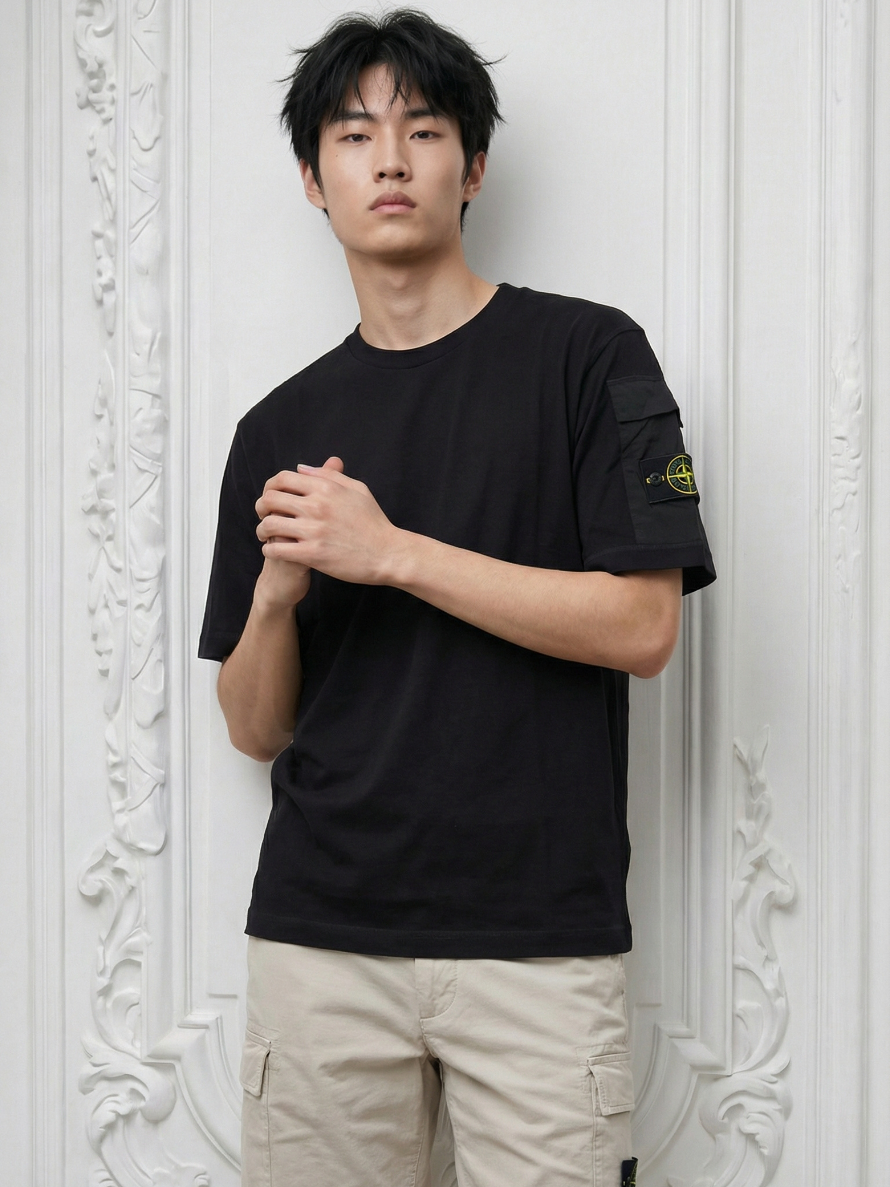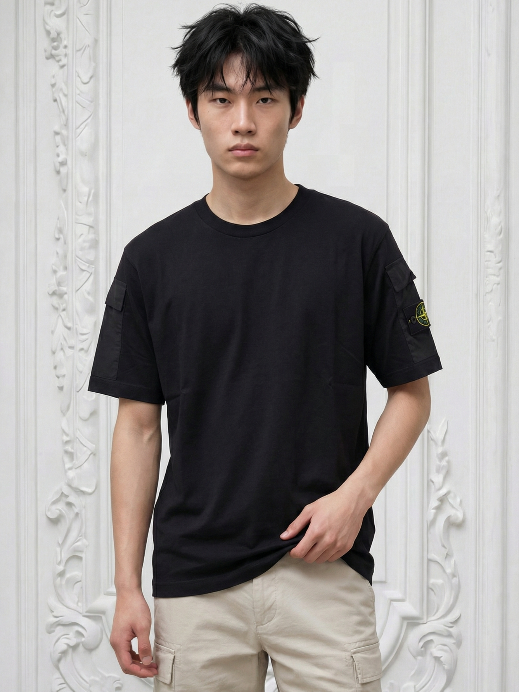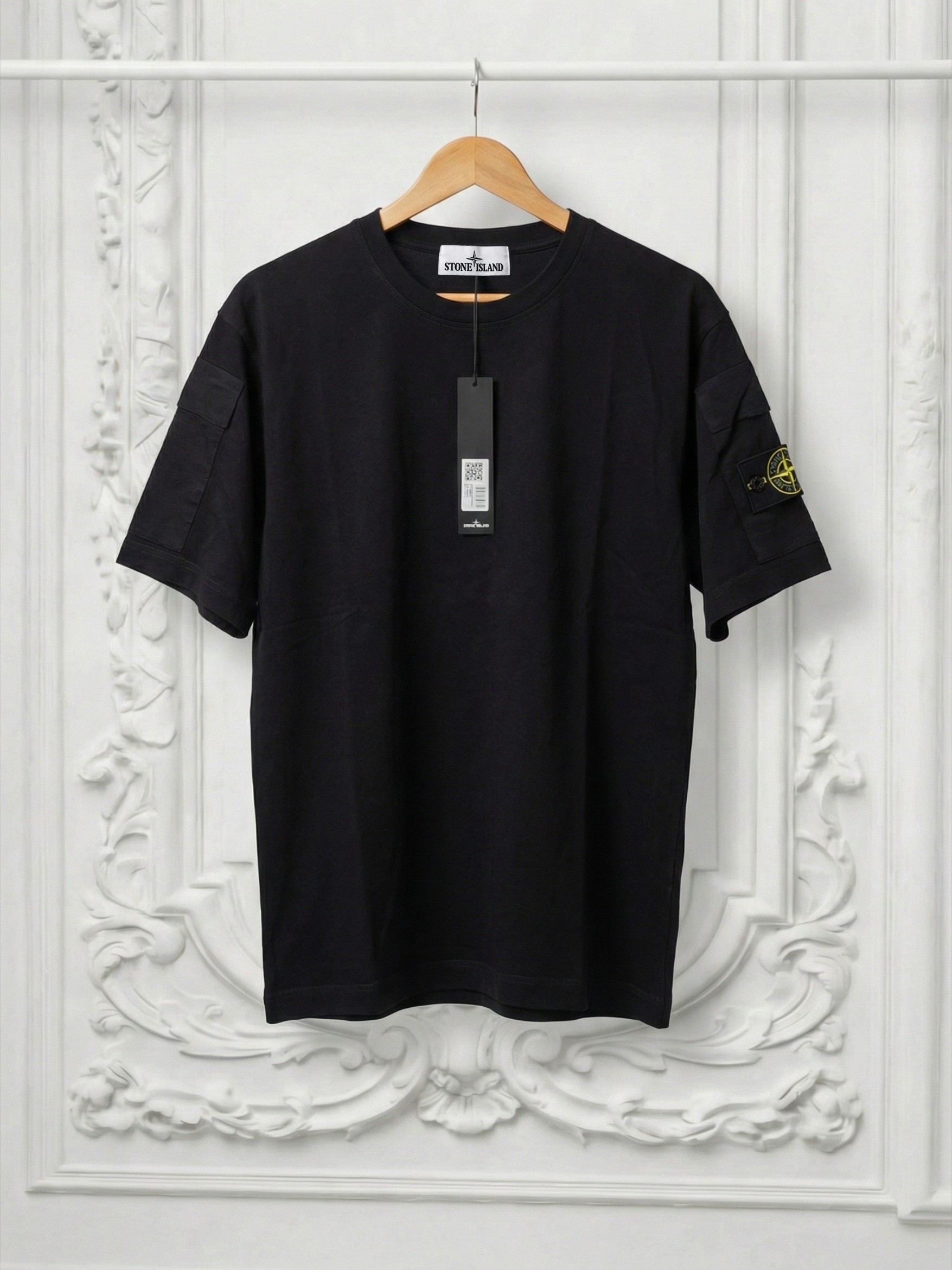 A modern stone island script logo inspire man black tshirt featuring premium quality fabric and stylish design. Designed for comfort and effortless style, perfect for both casual and elevated looks.